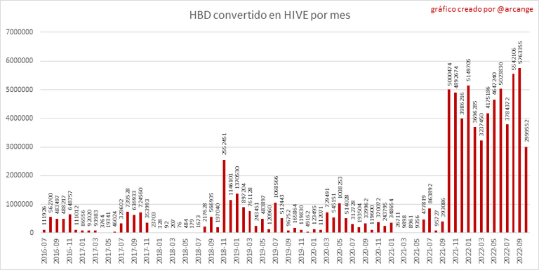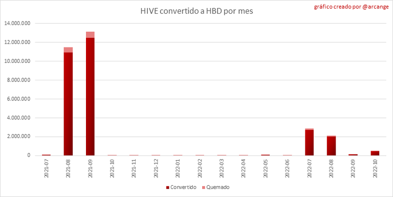 Estos gráficos muestran el número de HIVE realmente utilizado por el proceso de conversión (HIVE convertido + 5% HIVE fresco que se destruye) cada día y cada mes después de que se hayan finalizado las solicitudes de conversión de HIVE a HBD.