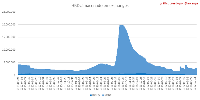 Estos gráficos muestran la evolución diaria de HIVE y HBD almacenados en los exchanges donde se enumeran.