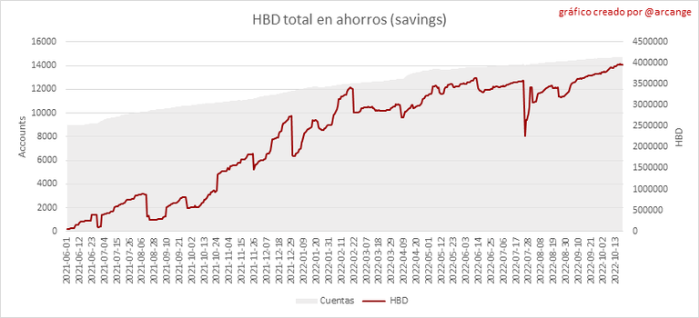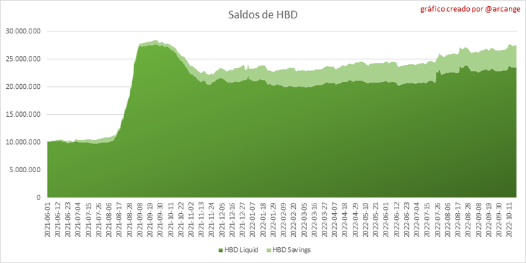 Este gráfico muestra el número de HBD, liquido y en ahorros, en todas las cuentas.