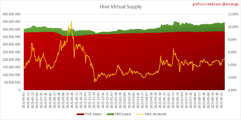 El gráfico también muestra el ratio de endeudamiento (oferta HBD / oferta virtual HIVE). Tenga en cuenta que desde el hardfork 24, los fondos en la cuenta de tesorería de Hive ([balance HBD de @hive.fund] (https://peakd.com/@hive.fund/wallet)) no se toman en cuenta en la proporción de deuda.