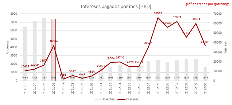 Este gráfico muestra el interés pagado mensualmente por mantener HBD y cuántas cuentas recibieron ese interés.