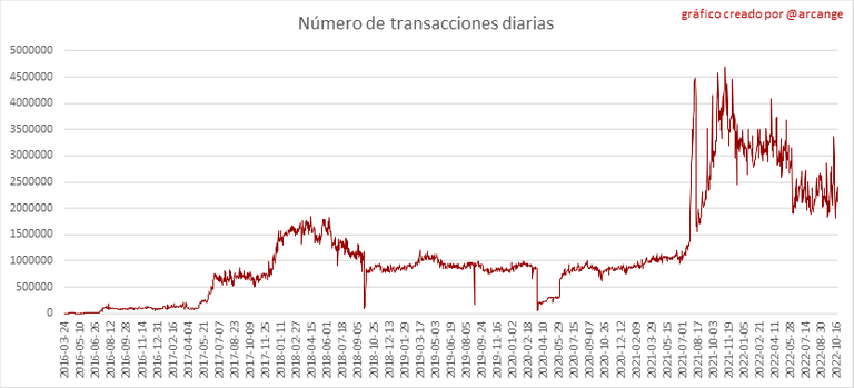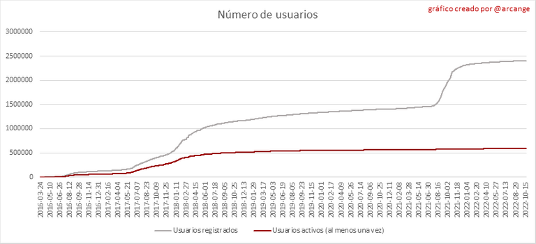 Este gráfico muestra la cantidad de usuarios recién registrados en la blockchain y cuántos de ellos son activos. ¡El gráfico es algo dinámico! Un usuario puede registrarse un día y volverse activo unos días después. por lo que los datos pueden cambiar de un día a otro.
