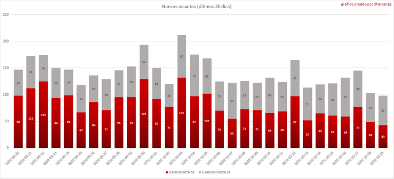 Estos dos gráficos muestran quién creó nuevas cuentas durante el último día y el número total de cuentas registradas. La línea roja muestra cuántas de ellas han estado activas al menos una vez (activa significa publicar un post, comentar o votar). Están incluidas incluso si se vuelven inactivos más tarde.