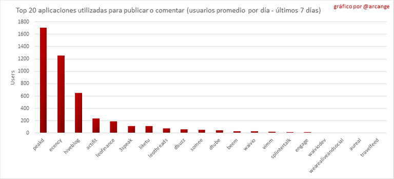 Este gráfico muestra qué aplicaciones se utilizan más para publicar posts y comentarios. Tenga en cuenta que el mismo usuario puede utilizar varias aplicaciones diferentes.
