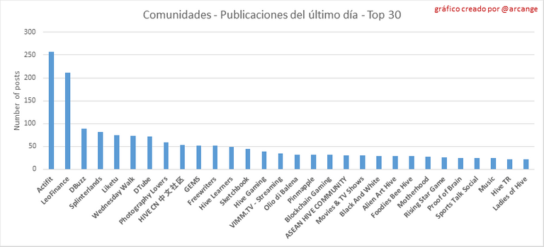 Estos gráficos muestran las comunidades más activas por número de publicaciones (vida útil de blockchain y último día).