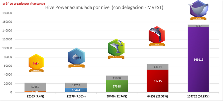 Este gráfico muestra la distribución de Hive Power acumulada por nivel de cuenta. El gráfico de la izquierda muestra la distribución sin tener en cuenta ninguna delegación realizada o recibida por las cuentas. Los gráficos de la derecha tienen en cuenta la delegación, agrega la delegación de HP recibida y resta la delegación de HP dada.