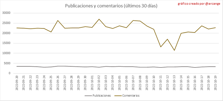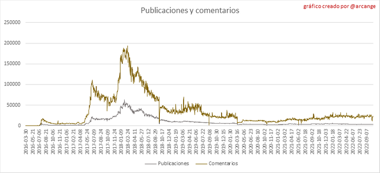 Estos gráficos muestran la evolución de publicaciones y comentarios durante toda la vida útil de la blockchain y durante los últimos 30 días.