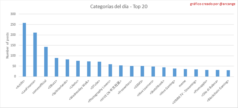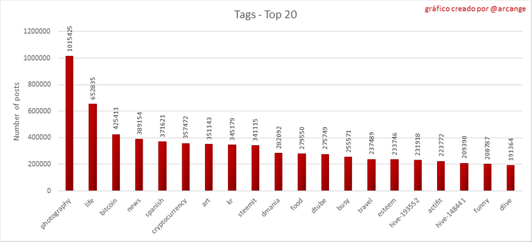 Estos gráficos muestran qué etiquetas principales han sido las más utilizadas para publicar posts durante toda la vida útil de la blockchain y durante el último día.