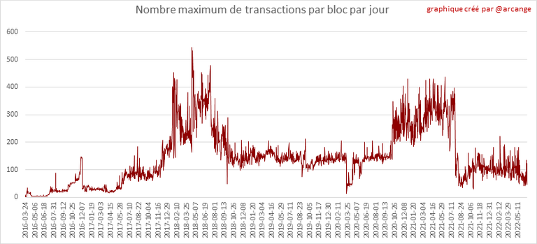 Ces graphiques montrent le nombre de transactions par jour, le nombre le plus élevé de transactions par bloc, le nombre moyen de transactions par bloc et le nombre de transactions par bloc au cours des 48 dernières heures. Cela vous donne une idée de toute l'activité sur la blockchain.