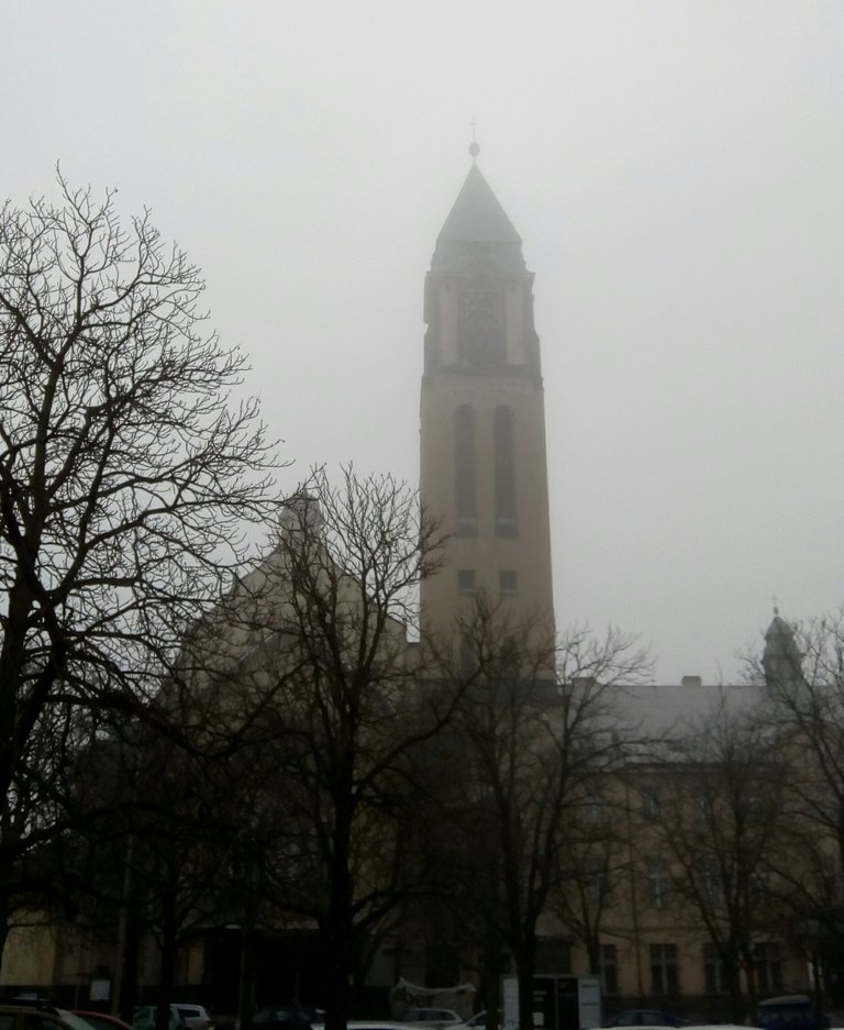 Na obrázku je ranní mlha na Jiráskovo náměstí s věží kostela Panny Marie Růžencové.