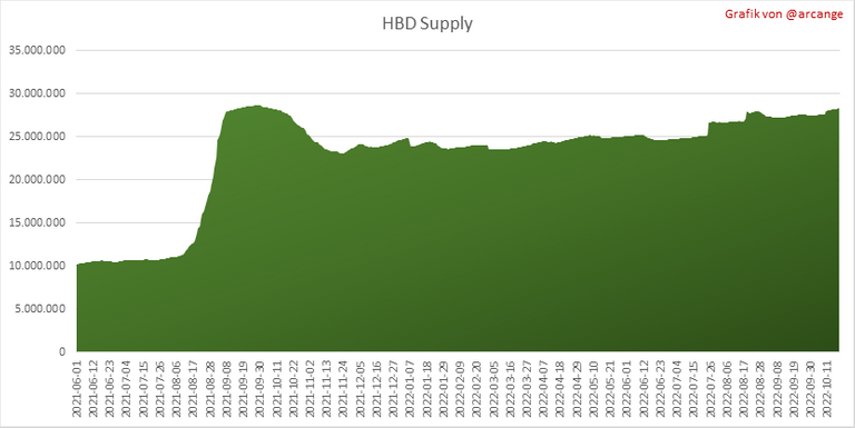 Diese Grafik zeigt die Entwicklung des virtuellen HIVE-Angebot. Das virtuelle Angebot ist die Summe aus HIVE-Angebot (flüssiges oder staked HIVE) und HBD-Angebot (umgerechnet in HIVE).