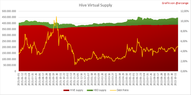 Die Grafik zeigt auch die Schuldenquote (HBD-Angebot / HIVE virtuelles Angebot). Bitte beachten, dass seit des Hardfork 24 die Treasury-Fonds von Hive (@hive.fund HBD-Saldo) nicht in der HBD-Schuldenquote berücksichtigt werden.