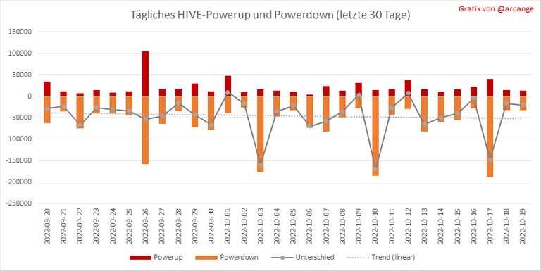 Diese Grafik zeigt das tägliche Powerup und Powerdown des HIVE und die resultierende Variation in den letzten 30 Tagen. Die Tabelle zeigt die Top-Powerups und Powerdowns des Tages.