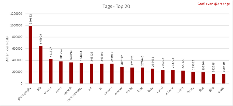 Diese Grafiken zeigen, welche Haupt-Tags für die Veröffentlichung von Posts über die gesamte Blockchain-Lebensdauer und am letzten Tag am häufigsten verwendet wurden.