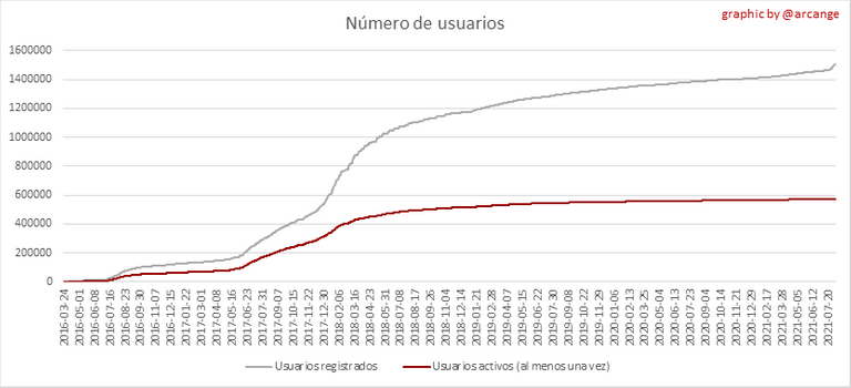 Este gráfico muestra la cantidad de usuarios recién registrados en la blockchain y cuántos de ellos son activos. ¡El gráfico es algo dinámico! Un usuario puede registrarse un día y volverse activo unos días después. por lo que los datos pueden cambiar de un día a otro.