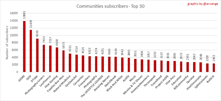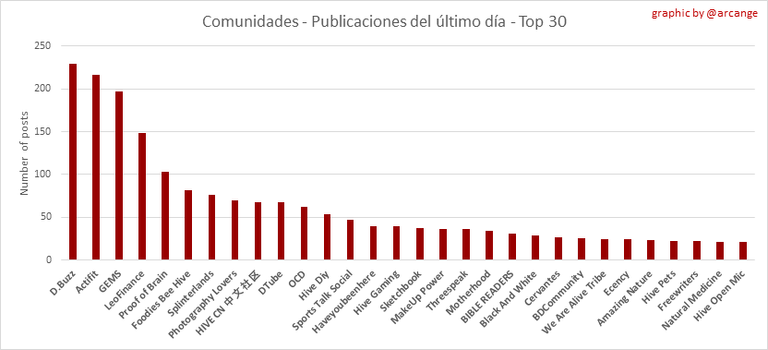 Estos gráficos muestran las comunidades más activas por número de publicaciones (vida útil de blockchain y último día).