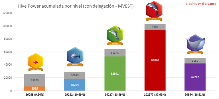 Este gráfico muestra la distribución de Hive Power acumulada por nivel de cuenta. El gráfico de la izquierda muestra la distribución sin tener en cuenta ninguna delegación realizada o recibida por las cuentas. Los gráficos de la derecha tienen en cuenta la delegación, agrega la delegación de HP recibida y resta la delegación de HP dada.