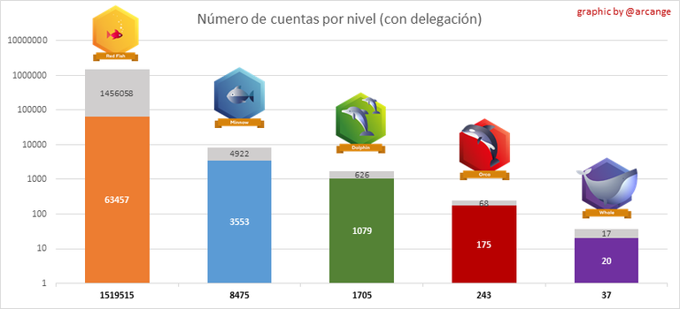 Estos gráficos muestran el número de usuarios según su Hive Power. El gráfico de la izquierda muestra la distribución sin tener en cuenta ninguna delegación realizada o recibida por las cuentas. El gráfico de la derecha tiene en cuenta la delegación, suma la delegación de HP recibida y resta la delegación de HP dada.