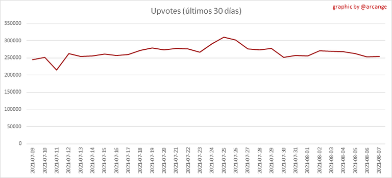 Estos gráficos muestran la evolución de la curación (upvotes) durante toda la vida útil de la blockchain y durante los últimos 30 días.