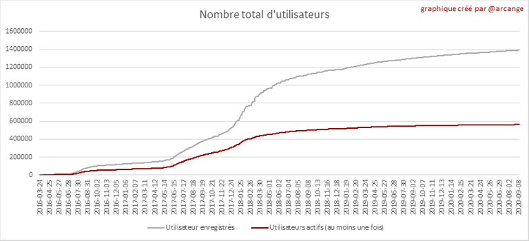 Ce graphique montre le nombre d'utilisateurs nouvellement inscrits sur la blockchain et combien d'entre eux sont devenus actifs. Nous voyons que beaucoup de comptes sont enregistrés, mais jamais utilisés. Ce graphique est un peu dynamique! Un utilisateur peut s'inscrire un jour et ne devenir actif que quelques jours plus tard. Par conséquent, le nombre d'utilisateurs actifs à une date donnée peut varier d'un jour à l'autre.