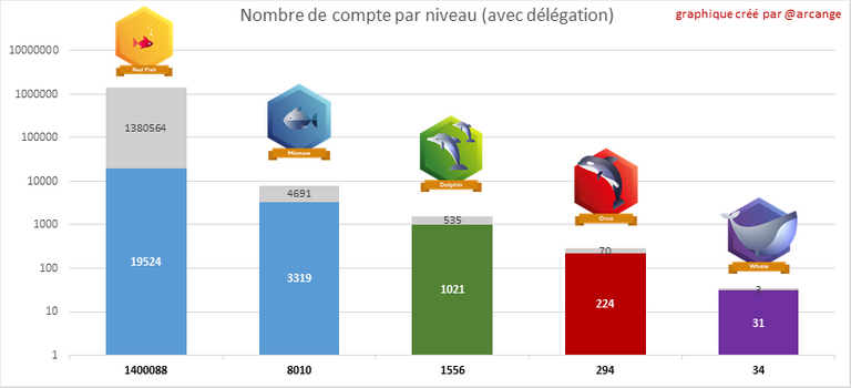 Ce graphique montre le nombre d'utilisateurs en fonction de leur Hive Power. Le graphique de gauche montre la répartition sans tenir compte des délégations données ou reçues. Le graphique de droite prend en compte la délégation en additionant les délégations reçues et en soustrayant les délégations données.
