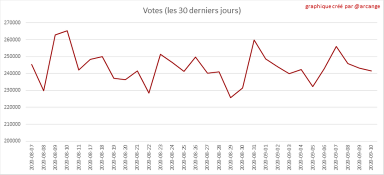 Ces graphiques montrent l'évolution de la curation (votes positifs) depuis la création de la blockchain et pour les 30 derniers jours.